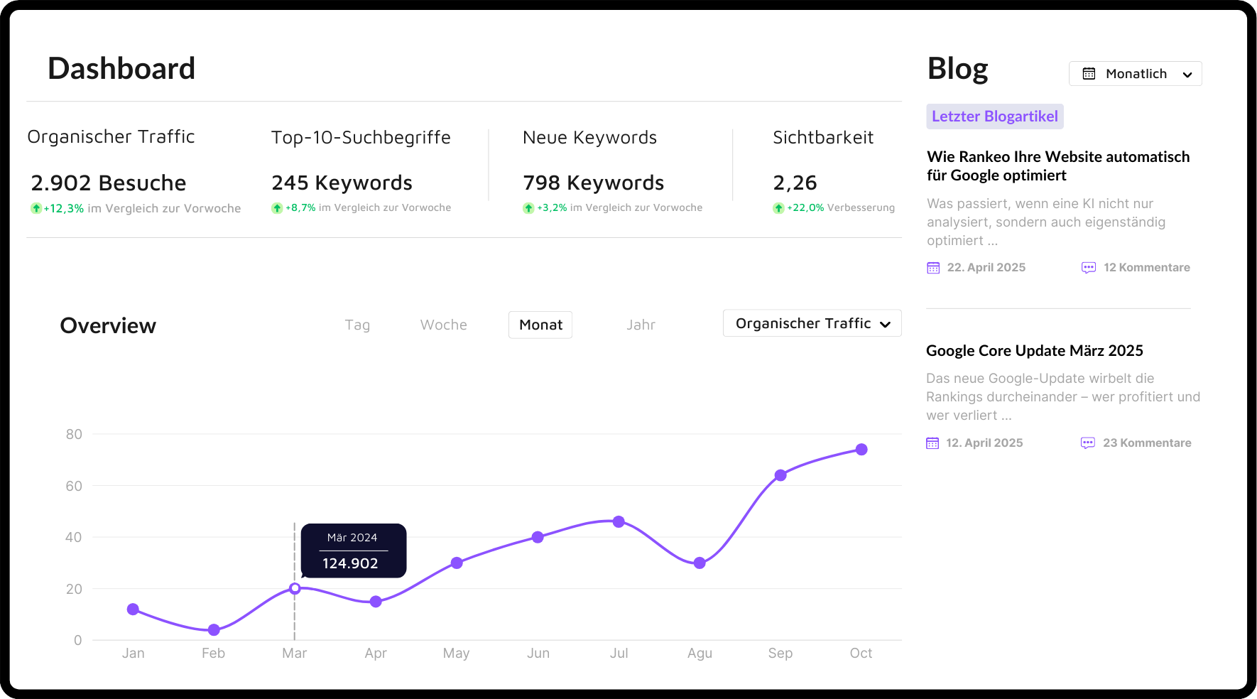Rankeo übernimmt die Arbeit automatisiert und datenbasiert – zum Bruchteil der Kosten eines SEO-Beraters.